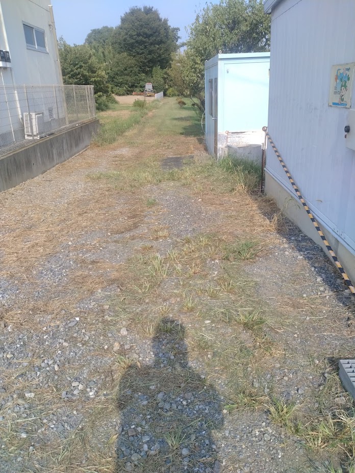 写真は公園の管理小屋の南側道路だが、ここが草だらけになのは辛いから砂利を削らない様に刃をなるべく上げて刈るが面倒な所。